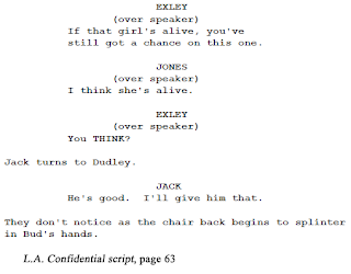 One of the protagonists, Bud White, follows up a lead, arriving at Patchett’s place. Bud, a thuggish cop, does his best to intimidate Patchett.